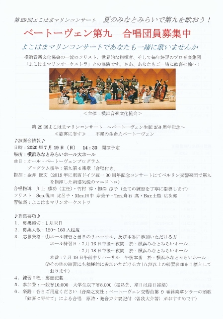 ①ホール練習と当日のリハーサル、及び本番に参加いただける方 ホール練習日:7月16日午後~夜間 於:横浜みなとみらいホール :7月18日午後~夜間 於:横浜みなとみらいホール 本番:7月19日午前中リハーサル 午後本番 於:横浜みなとみらいホール |