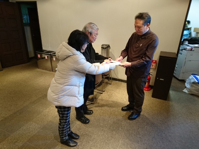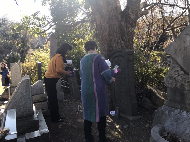 | ご参列いただきまして誠にありがとうございました。 財団法人横浜外国人墓地マネージャー・樋口詩生さんに、今回の「音楽墓前祭」と昨年12月「横浜居留地研究会&神奈川大学とのコラボレーションコンサート」で集まりました寄付金約10万円を、墓地維持保存の為にお渡しいたしました。 |